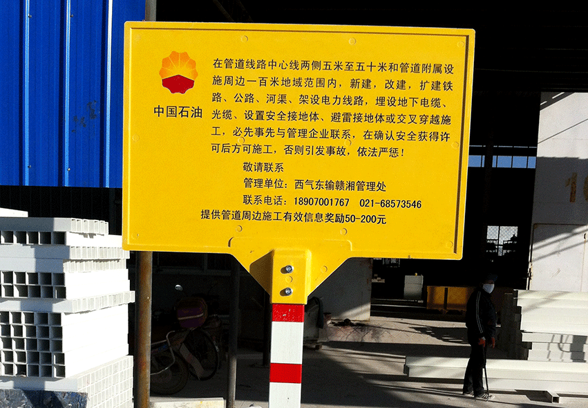 上圖為金能電力設(shè)備有限公司專門(mén)為中國(guó)石油天然氣股份有限公司西氣東輸工程制作的復(fù)合材料標(biāo)志牌。