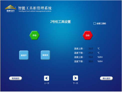 主頁數(shù)據(jù)顯示界面主要顯示的是各個柜子工具信息,包括柜內(nèi)、外溫濕度、工具名稱、配備數(shù)量、距檢天數(shù)、在位數(shù)量、在位情況等信息。編號圖標(biāo)顯示紅色則表示離位,綠色則表示在位。上下頁按鈕可進(jìn)行各柜子頁面切換。該界面還配有開門、設(shè)置、查詢界面的按鈕。狀態(tài)一欄有自動、手動兩種狀態(tài),表示的是此號柜中除濕機(jī)的工作狀態(tài)。自動狀態(tài)下,當(dāng)溫、濕度達(dá)到設(shè)定的范圍值則除濕機(jī)會自動打開或者關(guān)閉。手動狀態(tài)下,可以強(qiáng)制打開或者關(guān)閉除濕機(jī)。